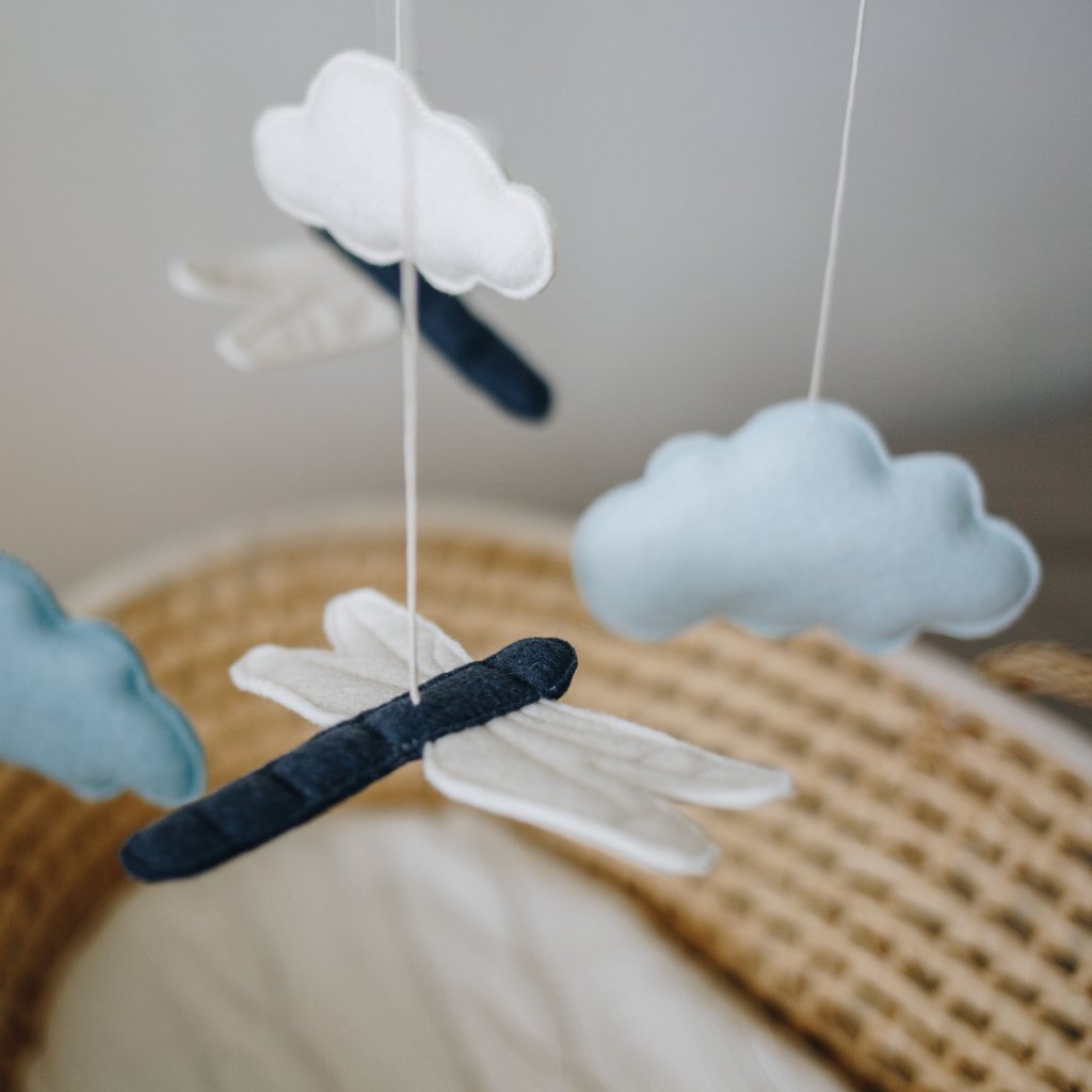 Kolotoč nad postýlku s hracím strojkem z merino vlny a bukového dřeva s vážkami a mráčky.